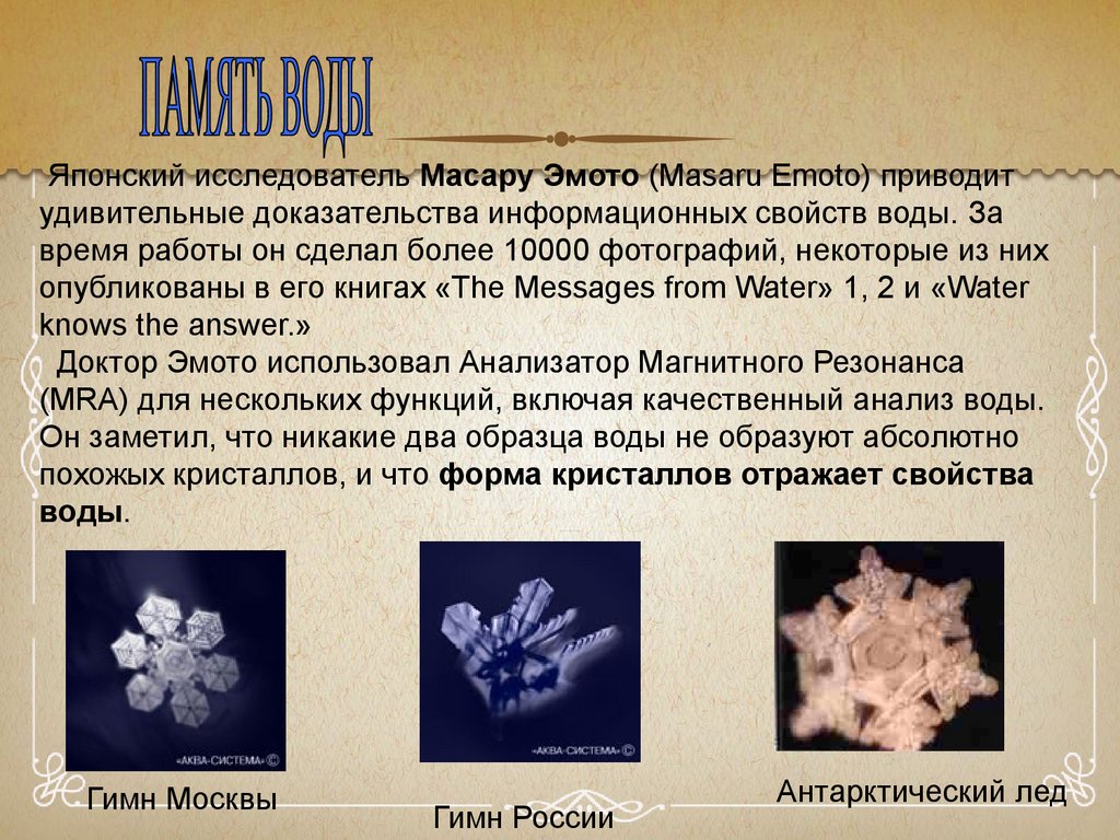 Японский исследователь Масару Эмото (Masaru Emoto) приводитудивительные доказательства информационных свойств воды. За