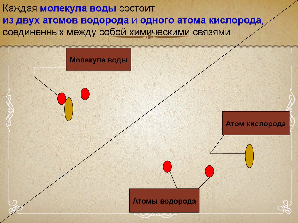 Каждая молекула воды состоитиз двух атомов водорода и одного атома кислорода,