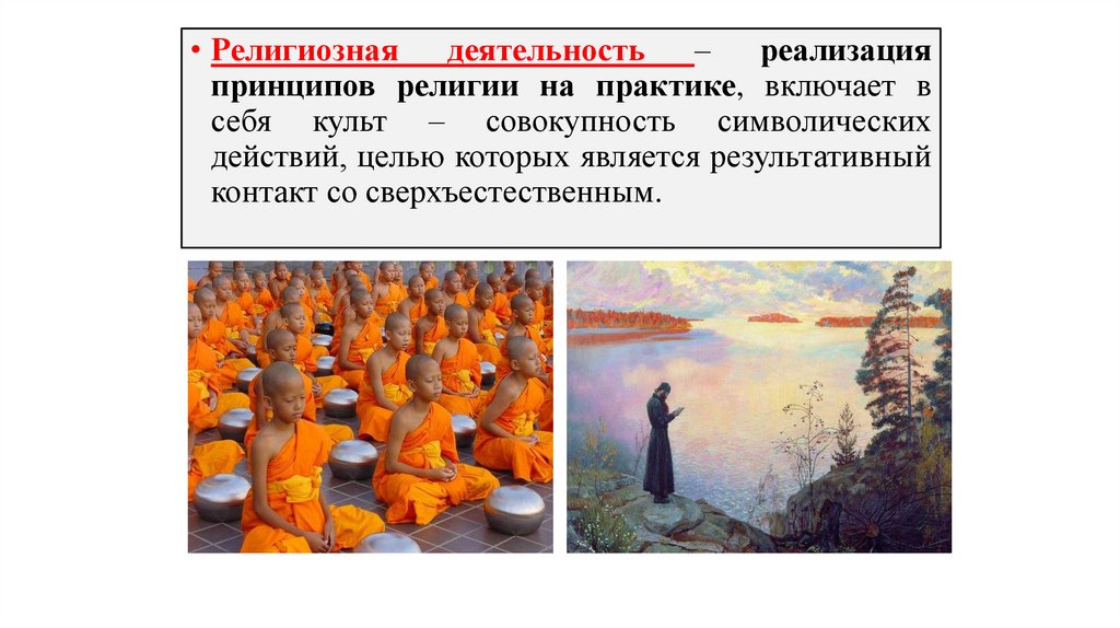 • Религиозная деятельность – реализацияпринципов религии на практике, включает в