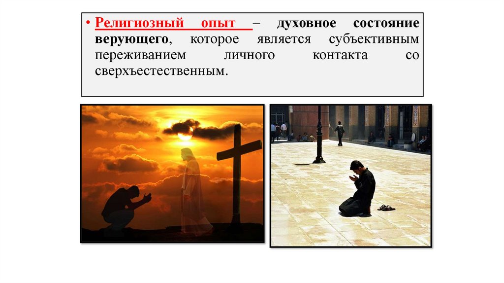 • Религиозный опыт – духовное состояниеверующего, которое является субъективным