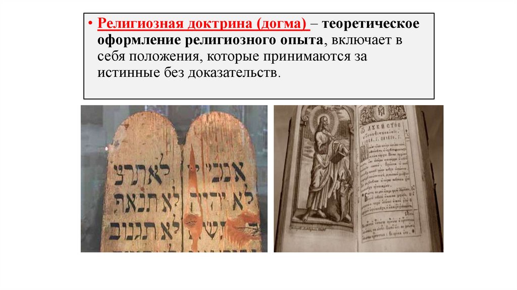• Религиозная доктрина (догма) – теоретическоеоформление религиозного опыта, включает в