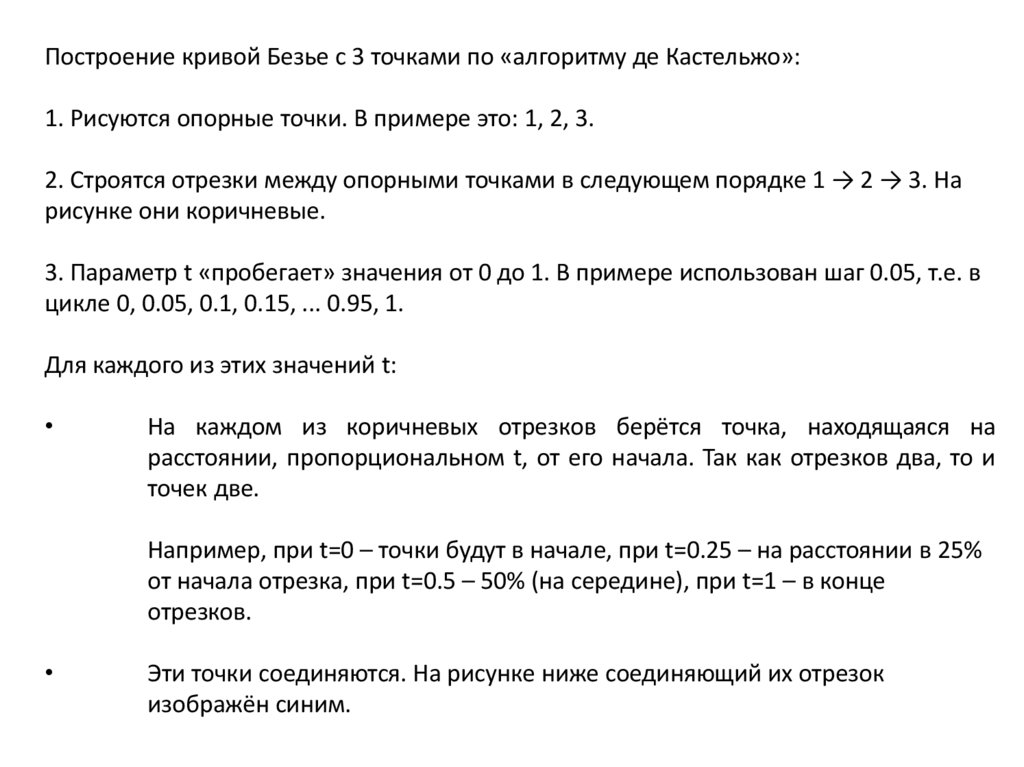 Построение кривой Безье с 3 точками по «алгоритму де Кастельжо»:1. Рисуются опорные точки. В примере это: 1, 2, 3.