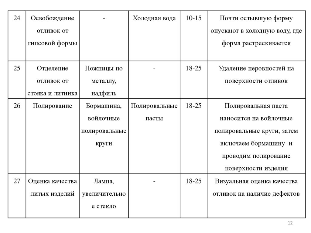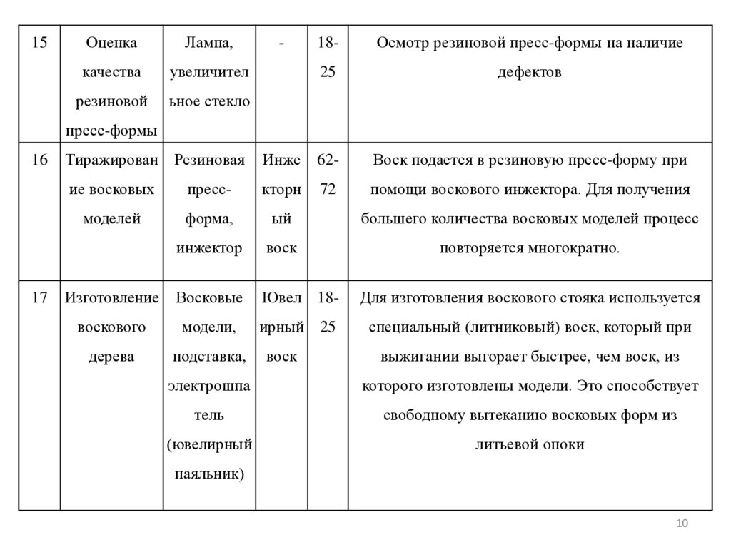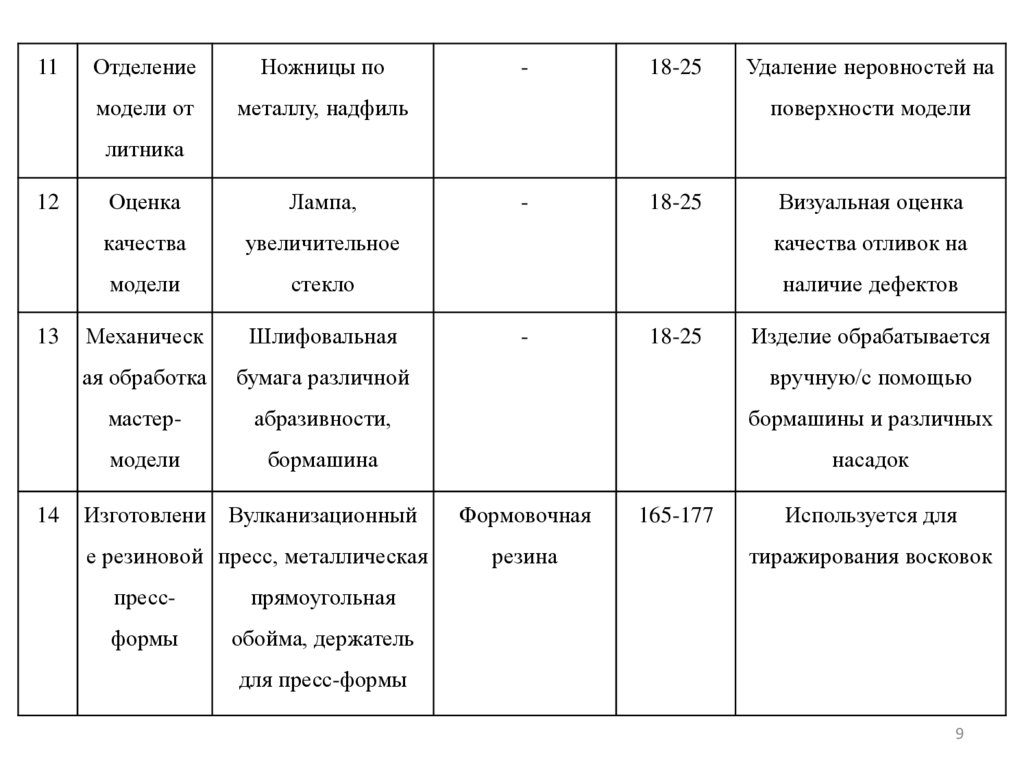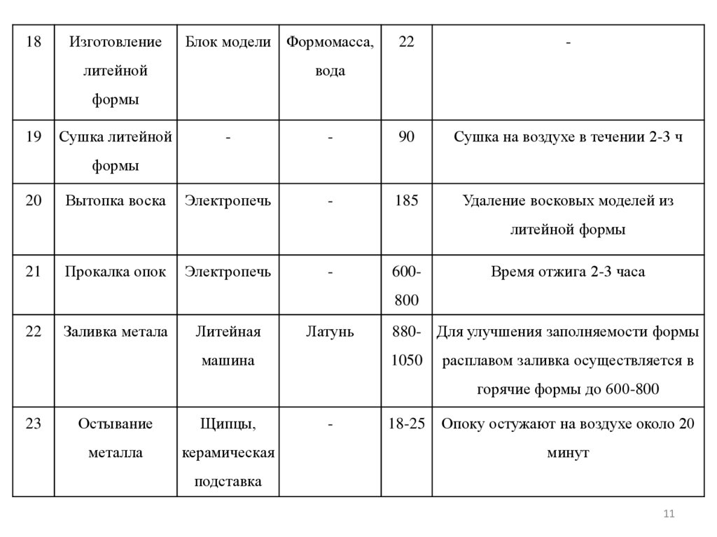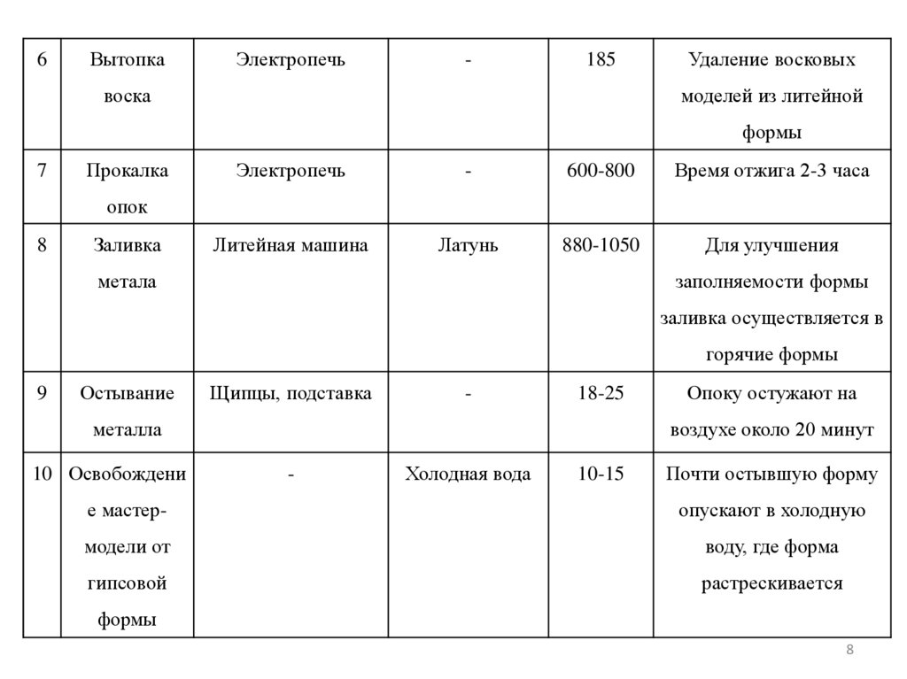 7. Таблица 1. Технологическая схема изготовления методом литья по выплавляемым моделям