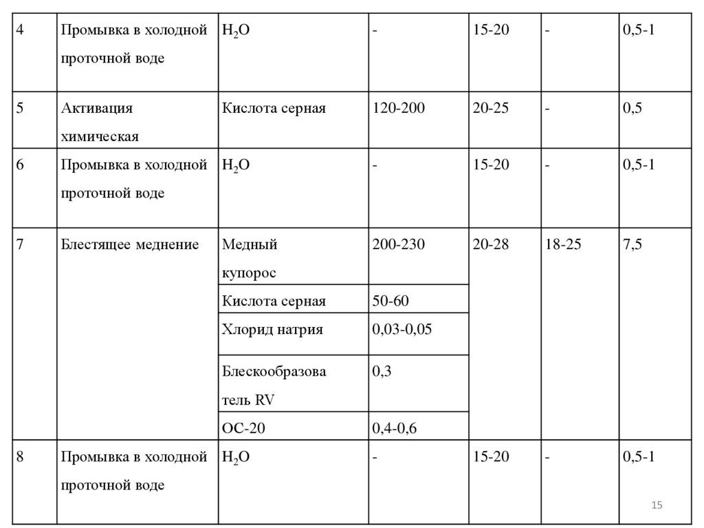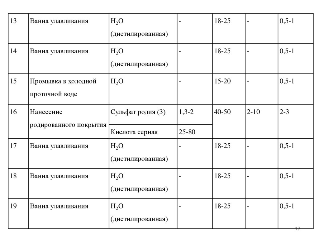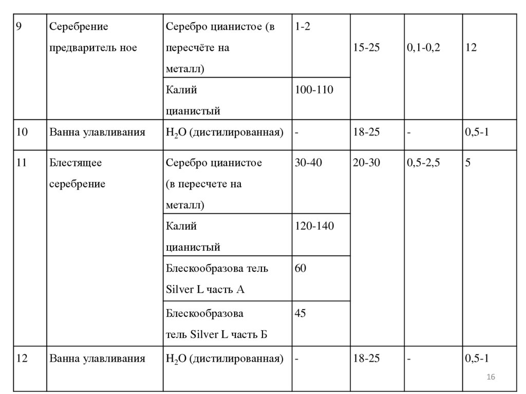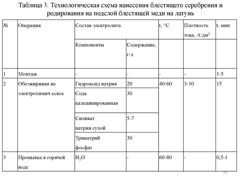 Таблица 3. Технологическая схема нанесения блестящего серебрения иродирования на подслой блестящей меди на латунь