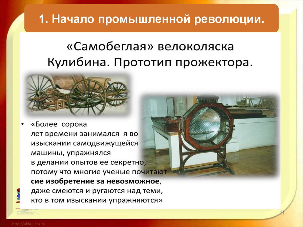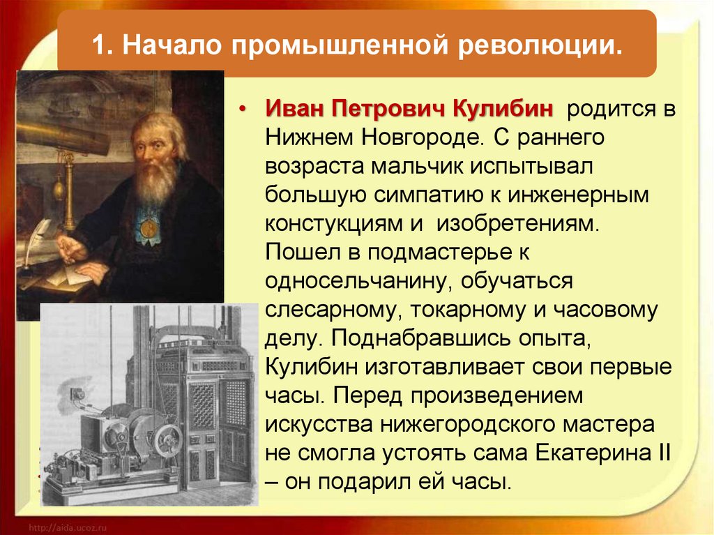1. Начало промышленной революции.• Иван Петрович Кулибин родится в
