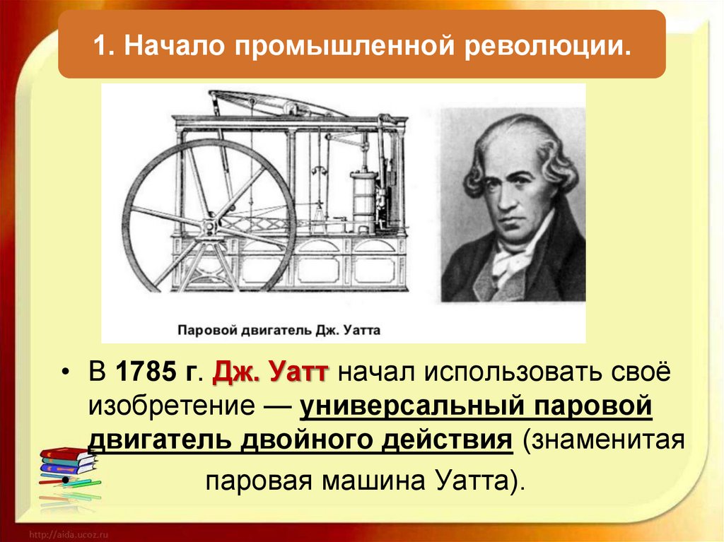 1. Начало промышленной революции.• В 1785 г. Дж. Уатт начал использовать своё