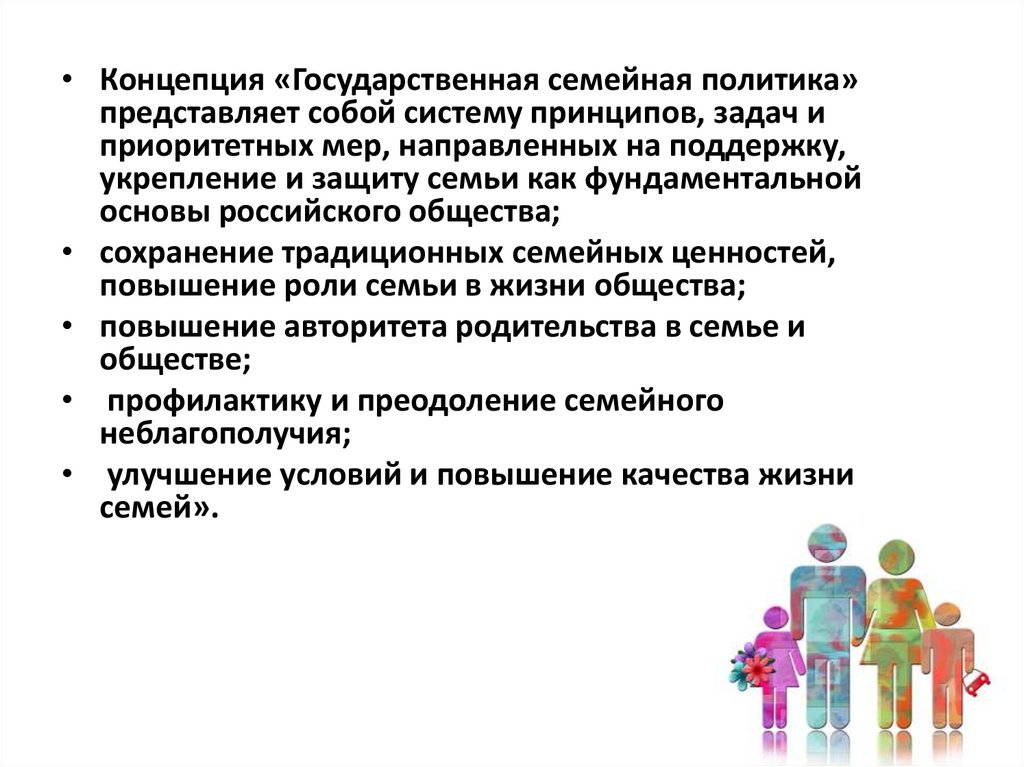 • Концепция «Государственная семейная политика»представляет собой систему принципов, задач и