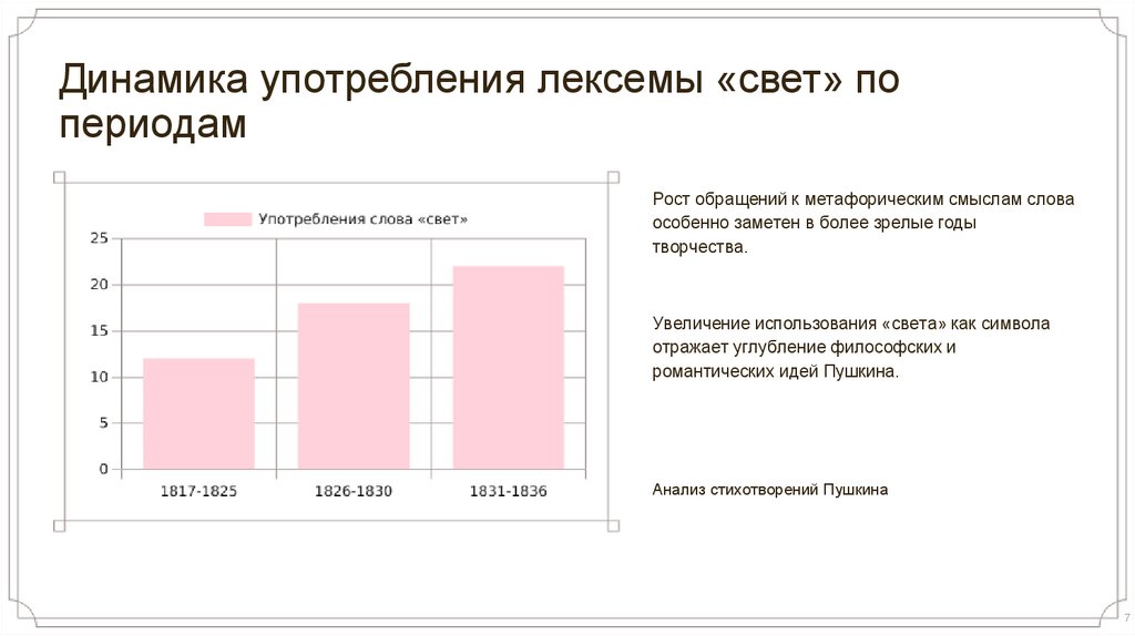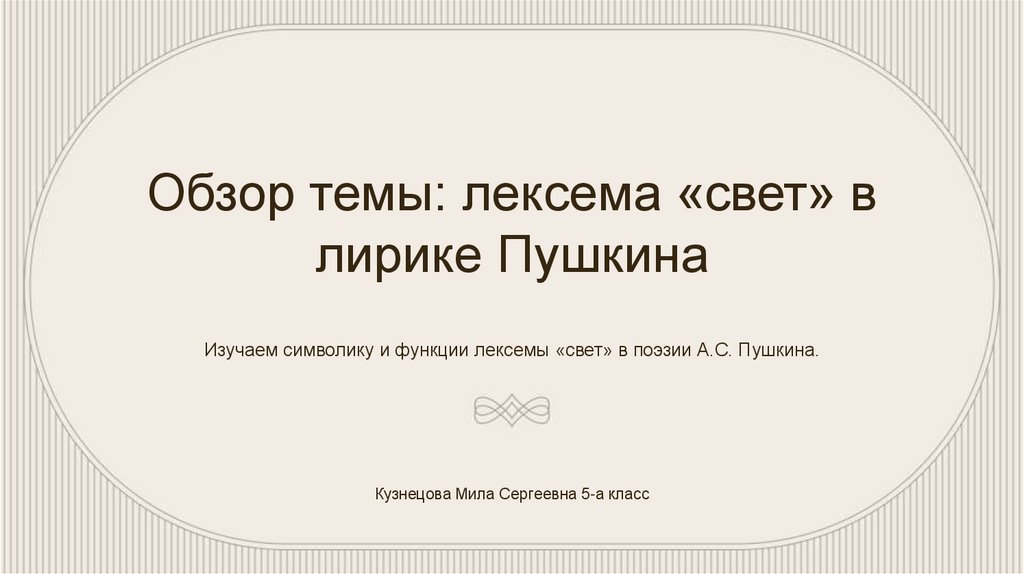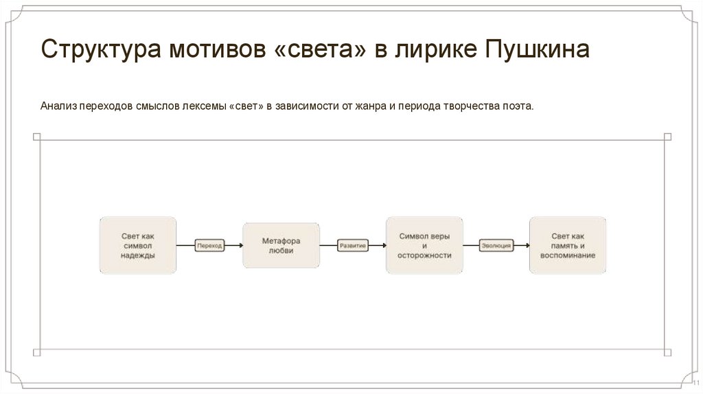 Структура мотивов «света» в лирике ПушкинаАнализ переходов смыслов лексемы «свет» в зависимости от жанра и периода творчества поэта.