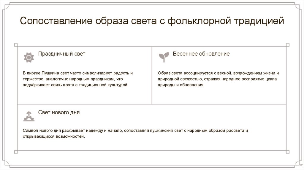 Символ нового дня раскрывает надежду и начало, сопоставляя пушкинский свет с народным образом рассвета и