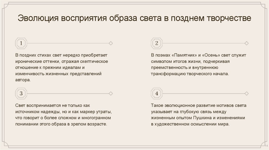 Эволюция восприятия образа света в позднем творчествеВ поздних стихах свет нередко приобретает
