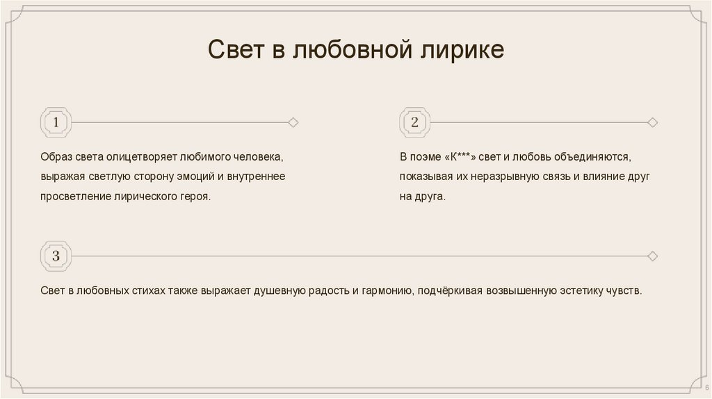 Свет в любовных стихах также выражает душевную радость и гармонию, подчёркивая возвышенную эстетику чувств.