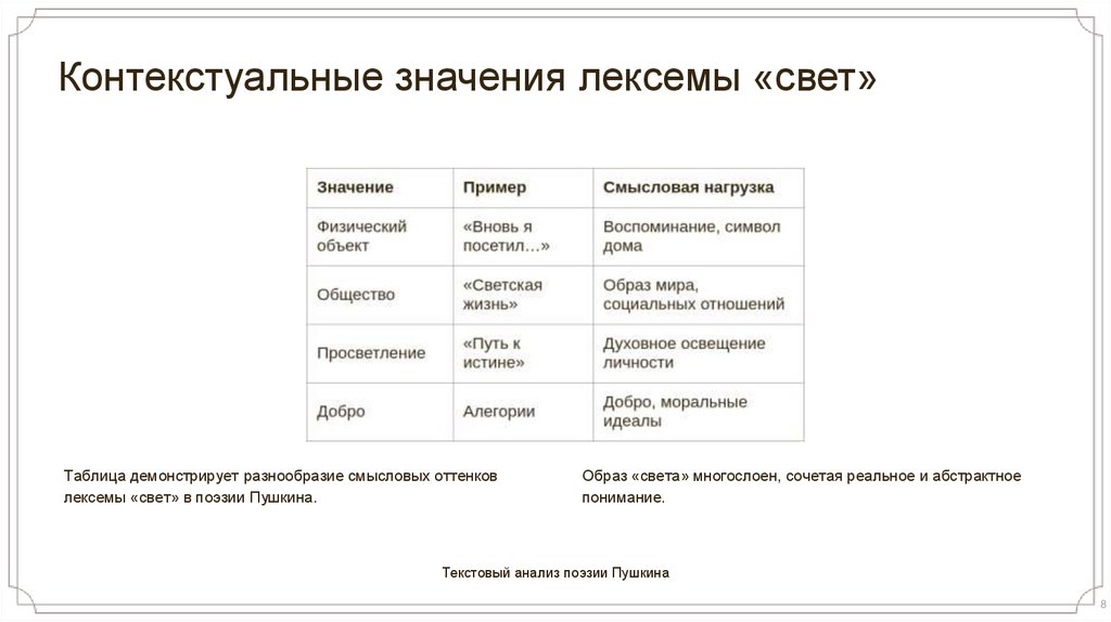 Контекстуальные значения лексемы «свет»Таблица демонстрирует разнообразие смысловых оттенков