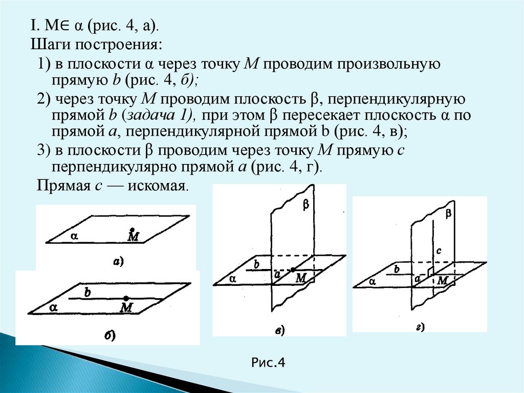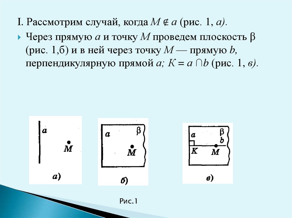 I. Рассмотрим случай, когда М ∉ а (рис. 1, а).Через прямую а и точку М проведем плоскость β