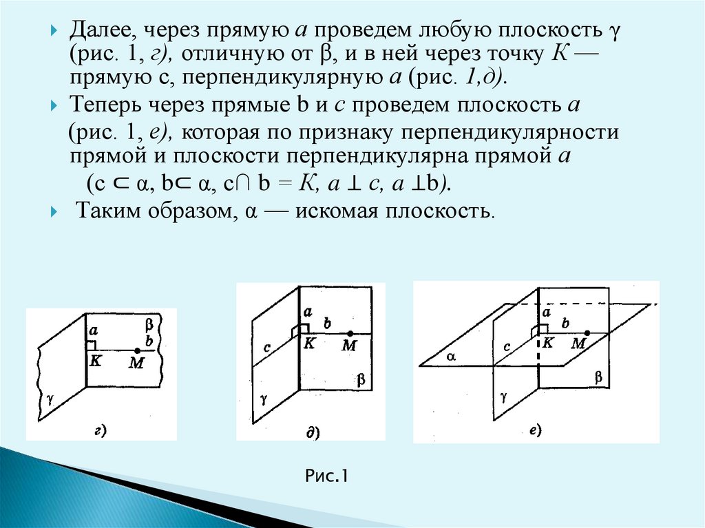 Далее, через прямую а проведем любую плоскость γ(рис. 1, г), отличную от β, и в ней через точку К —