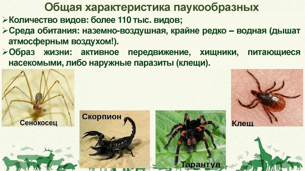 Общая характеристика паукообразныхКоличество видов: более 110 тыс. видов;