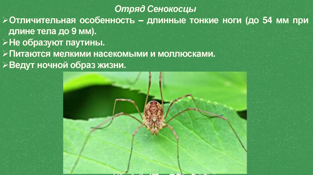 Отряд СенокосцыОтличительная особенность – длинные тонкие ноги (до 54 мм при