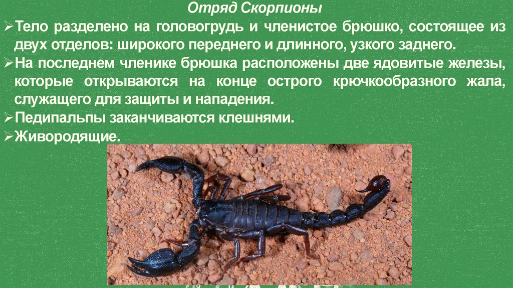 Отряд СкорпионыТело разделено на головогрудь и членистое брюшко, состоящее из