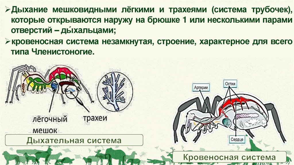 Дыхание мешковидными лёгкими и трахеями (система трубочек),которые открываются наружу на брюшке 1 или несколькими парами