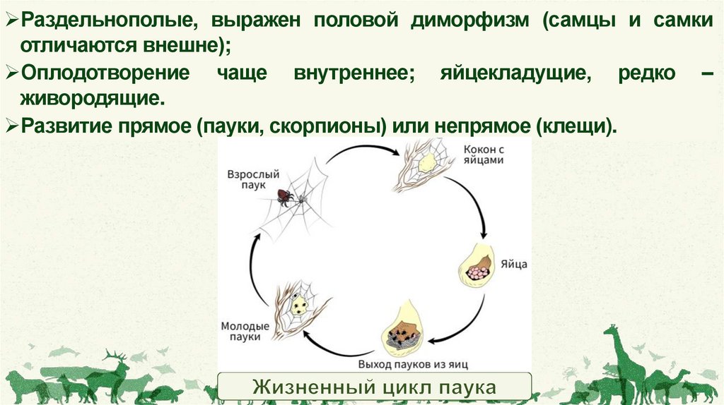 Развитие прямое (пауки, скорпионы) или непрямое (клещи).