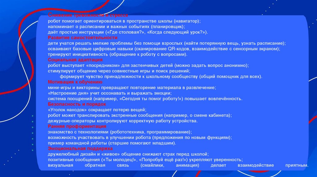 Снижение тревожности и стрессаробот помогает ориентироваться в пространстве школы (навигатор);