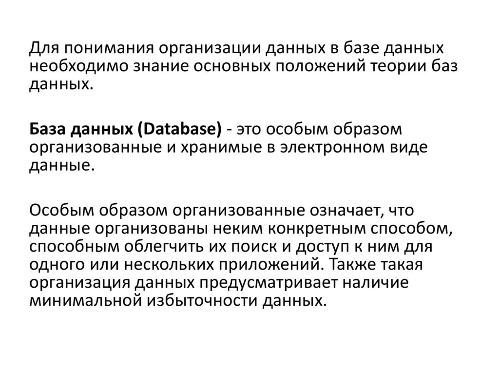 Для понимания организации данных в базе данныхнеобходимо знание основных положений теории баз