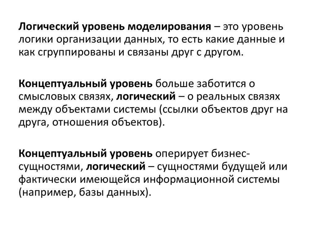 Концептуальный уровень оперирует бизнессущностями, логический – сущностями будущей или