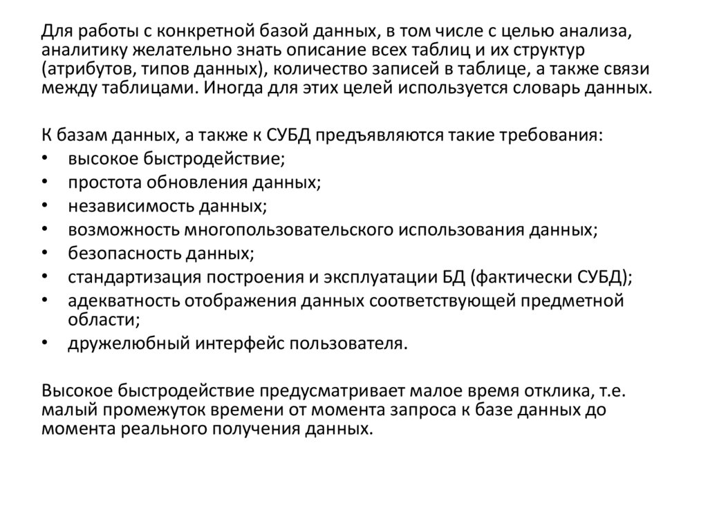 К базам данных, а также к СУБД предъявляются такие требования: