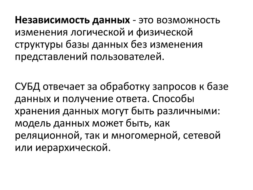 Независимость данных - это возможностьизменения логической и физической