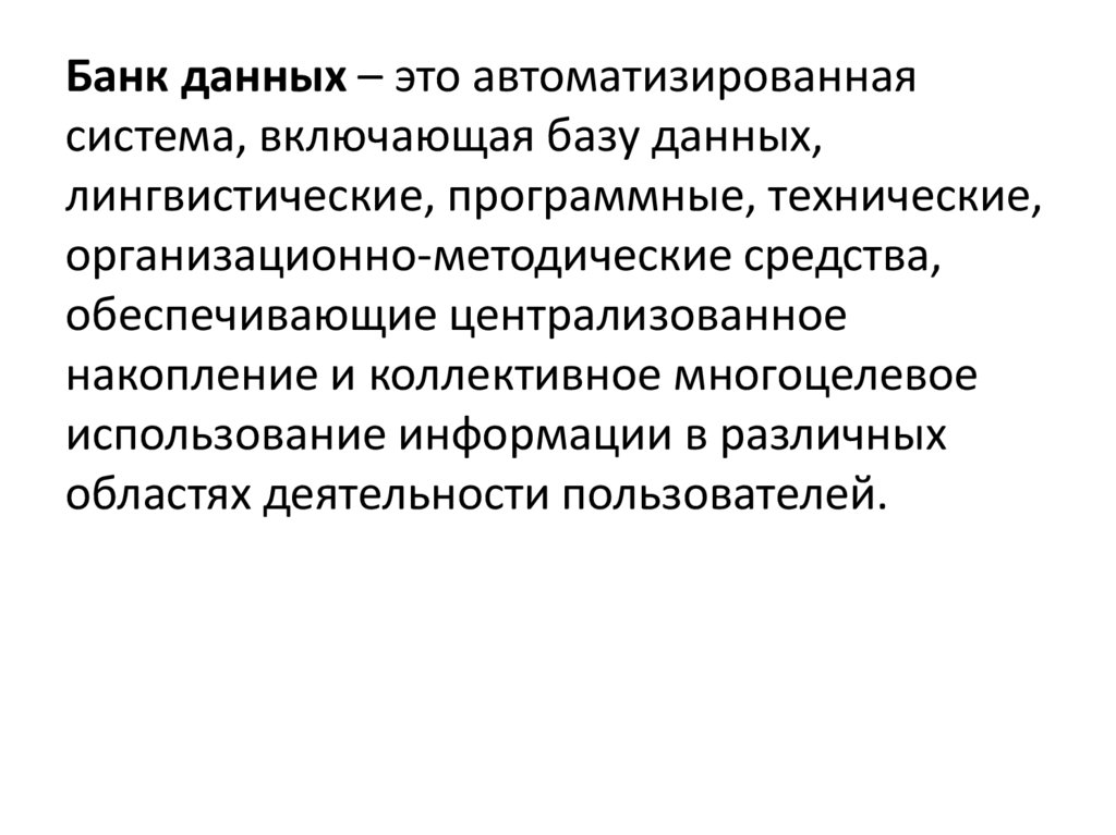 Банк данных – это автоматизированнаясистема, включающая базу данных,