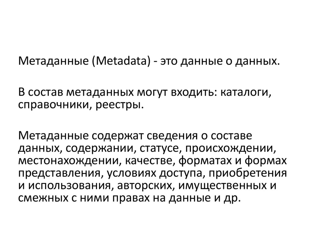 Метаданные (Metadata) - это данные о данных.В состав метаданных могут входить: каталоги,