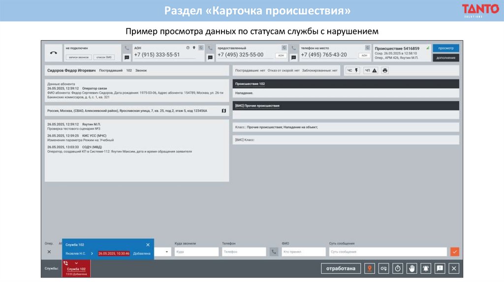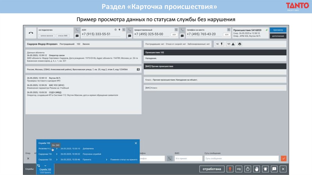 Раздел «Карточка происшествия»Пример просмотра данных по статусам службы с нарушением