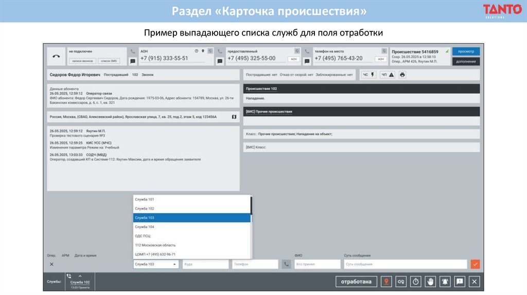 Раздел «Карточка происшествия»Пример выпадающего списка служб для поля отработки