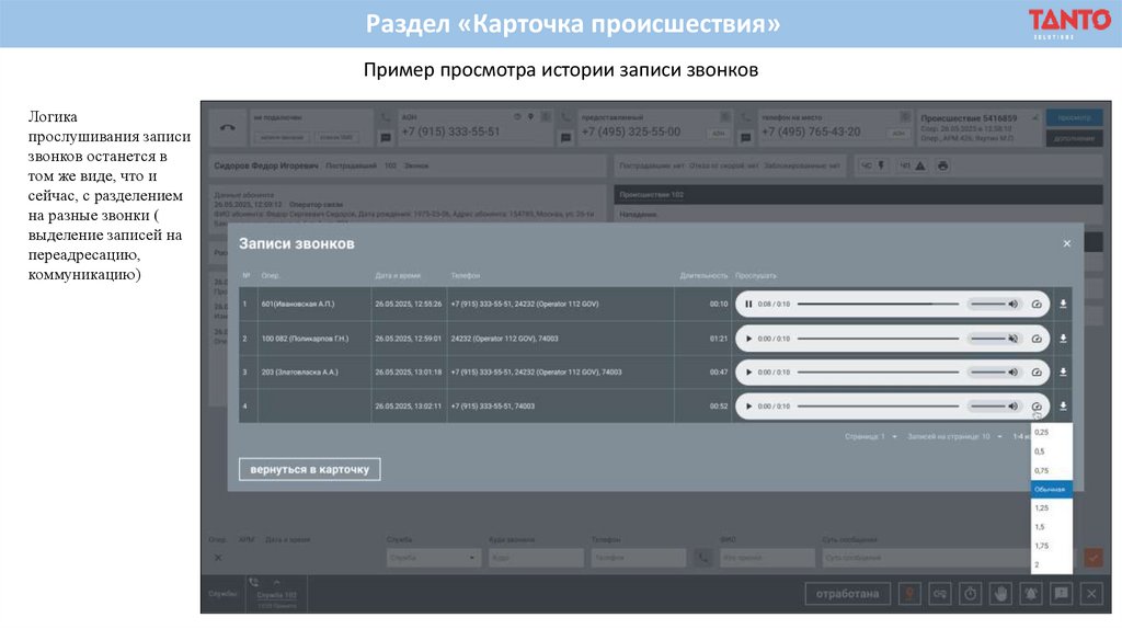 Раздел «Карточка происшествия»Пример просмотра истории записи звонков