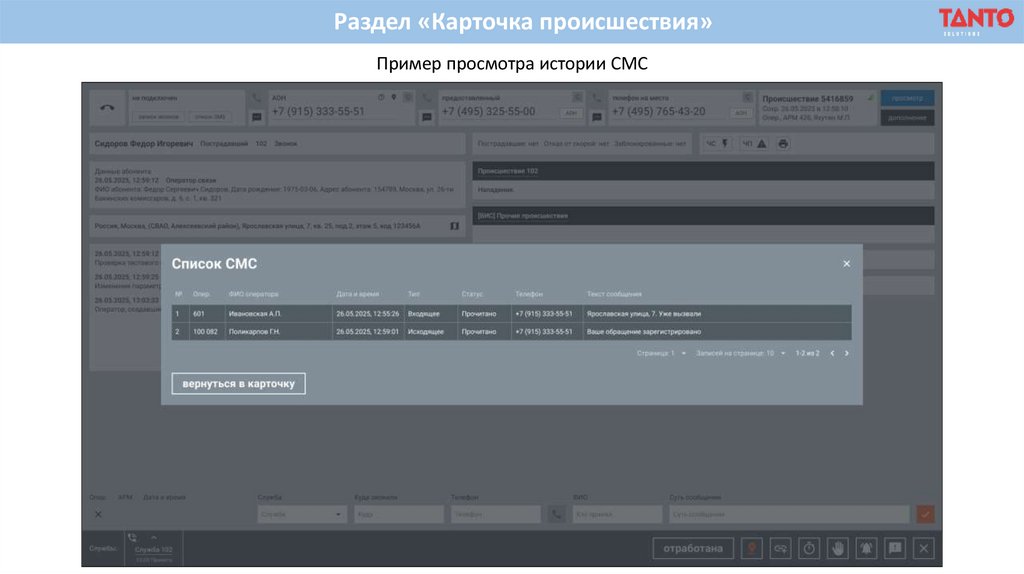 Раздел «Карточка происшествия»Пример просмотра истории СМС