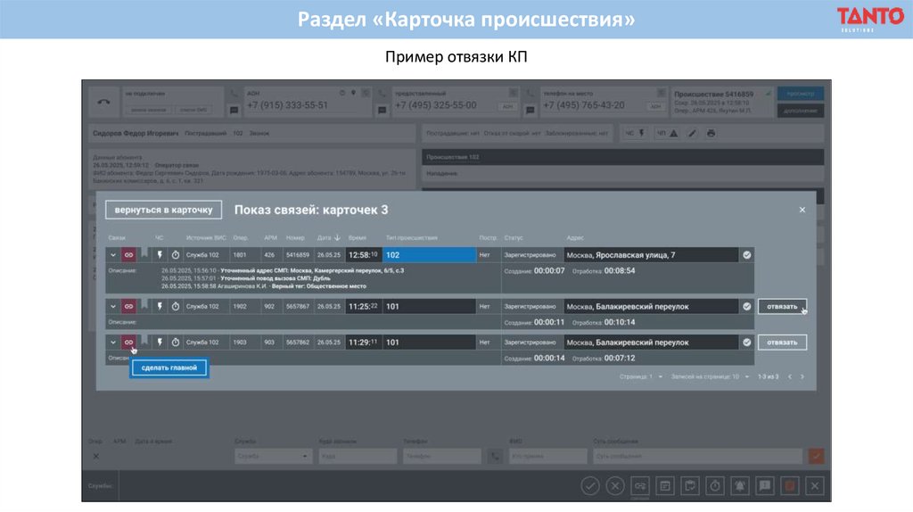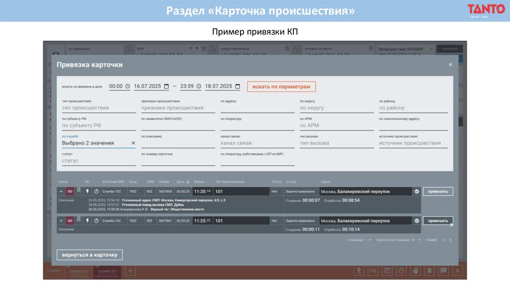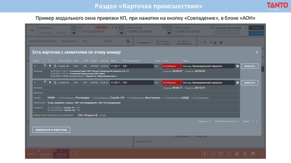 Раздел «Карточка происшествия»Пример модального окна привязки КП, при нажатии на кнопку «Совпадение», в блоке «АОН»