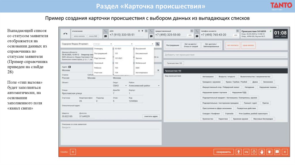 Раздел «Карточка происшествия»Пример создания карточки происшествия с выбором данных из выпадающих списков