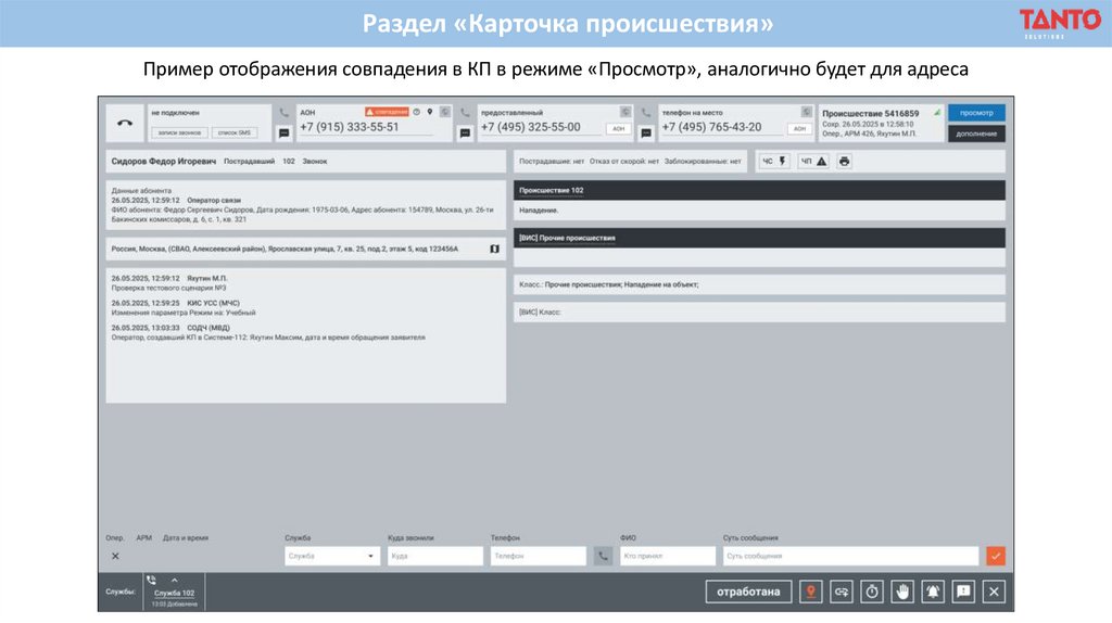 Раздел «Карточка происшествия»Пример отображения совпадения в КП в режиме «Просмотр», аналогично будет для адреса