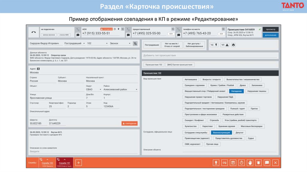 Раздел «Карточка происшествия»Пример отображения совпадения в КП в режиме «Редактирование»
