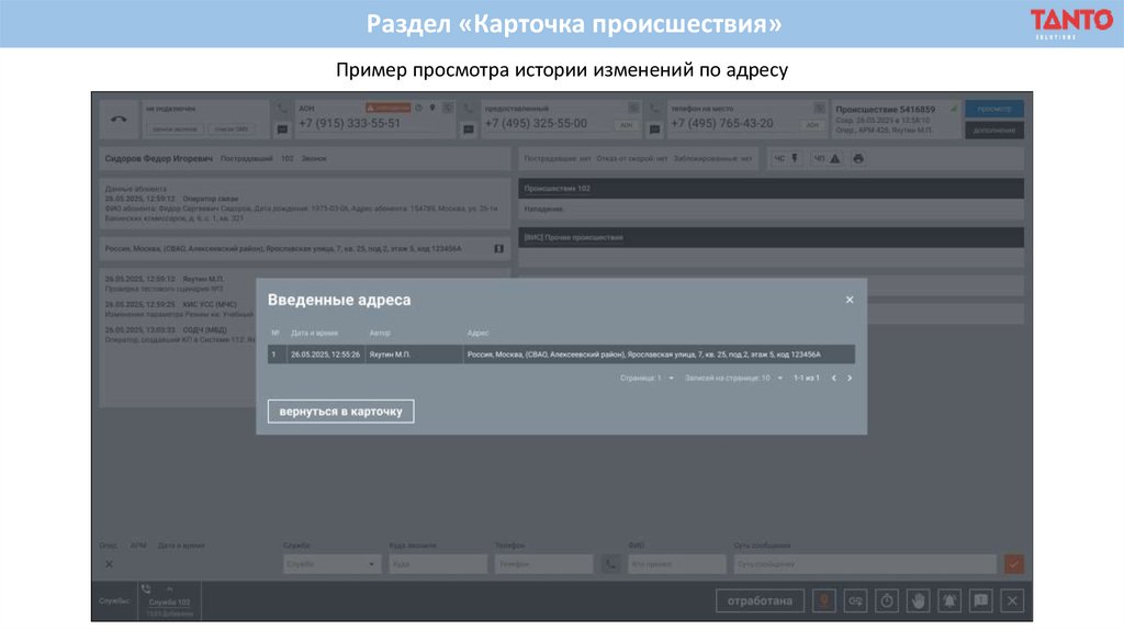Раздел «Карточка происшествия»Пример просмотра истории изменений по адресу