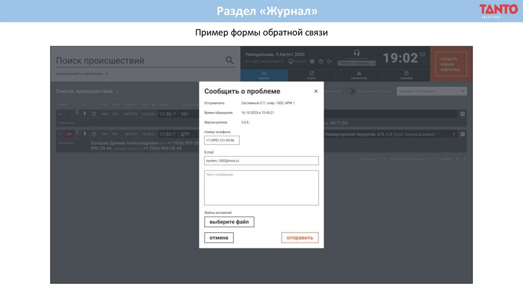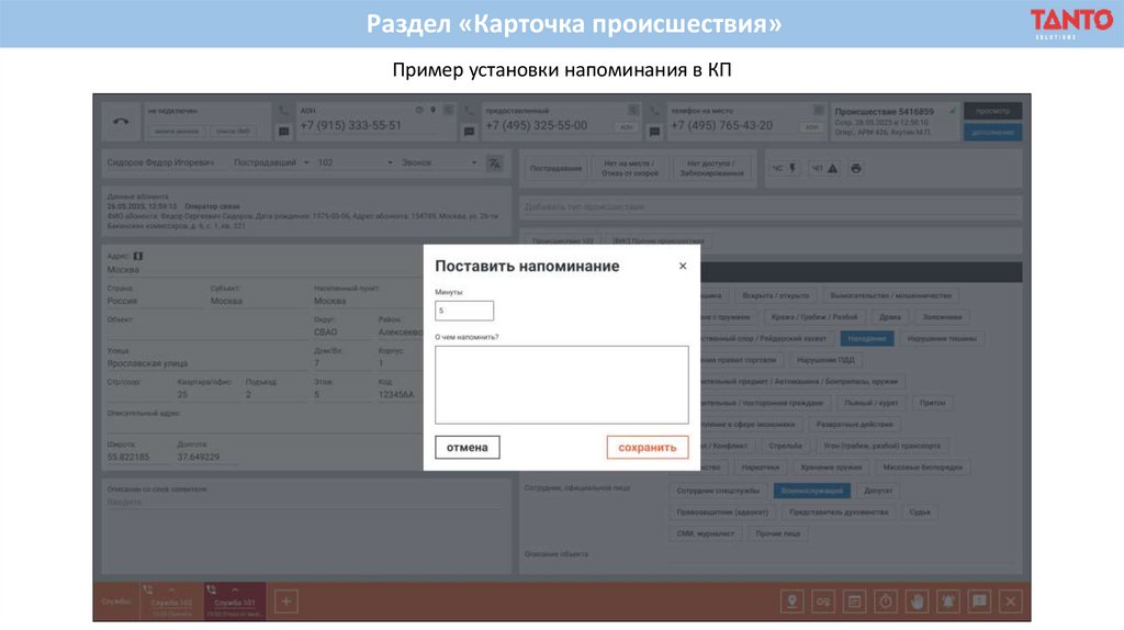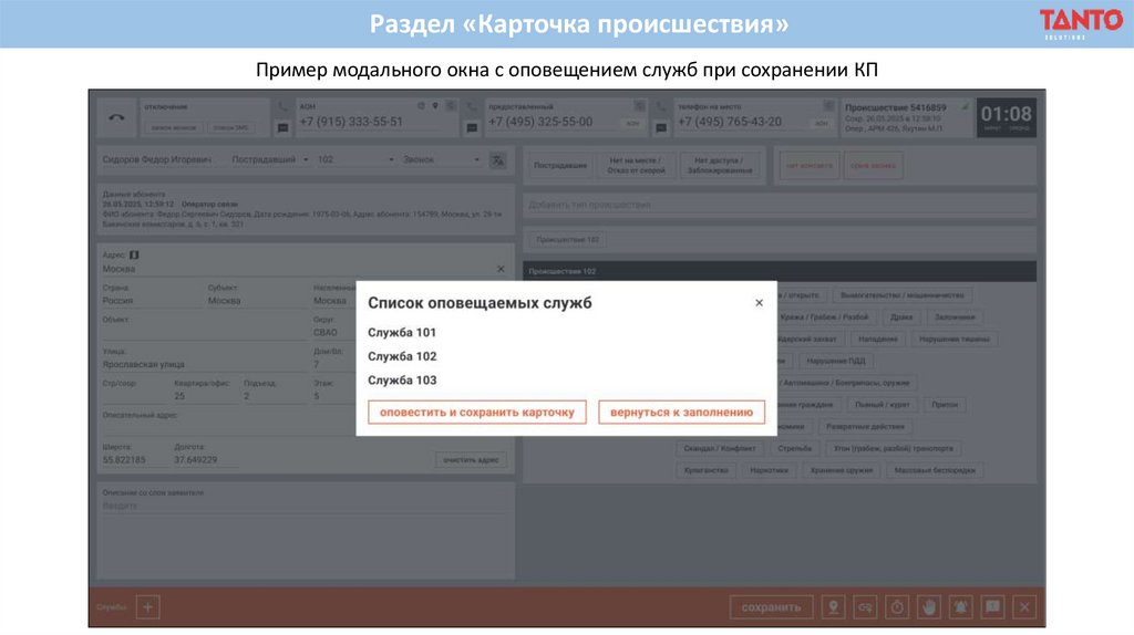 Раздел «Карточка происшествия»Пример модального окна с оповещением служб при сохранении КП
