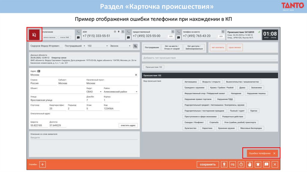 Раздел «Карточка происшествия»Пример отображения ошибки телефонии при нахождении в КП