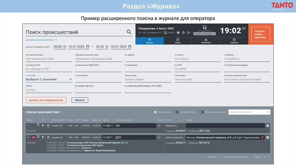 Раздел «Журнал»Пример расширенного поиска в журнале для оператора