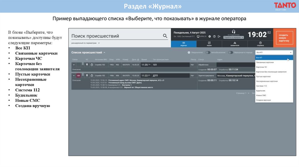 Раздел «Журнал»Пример выпадающего списка «Выберите, что показывать» в журнале оператора