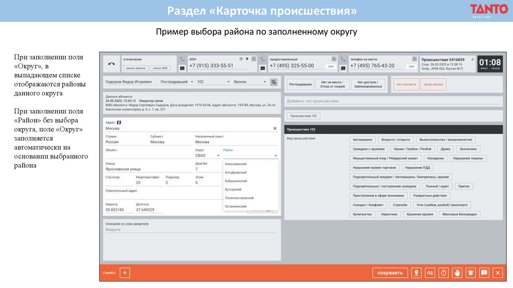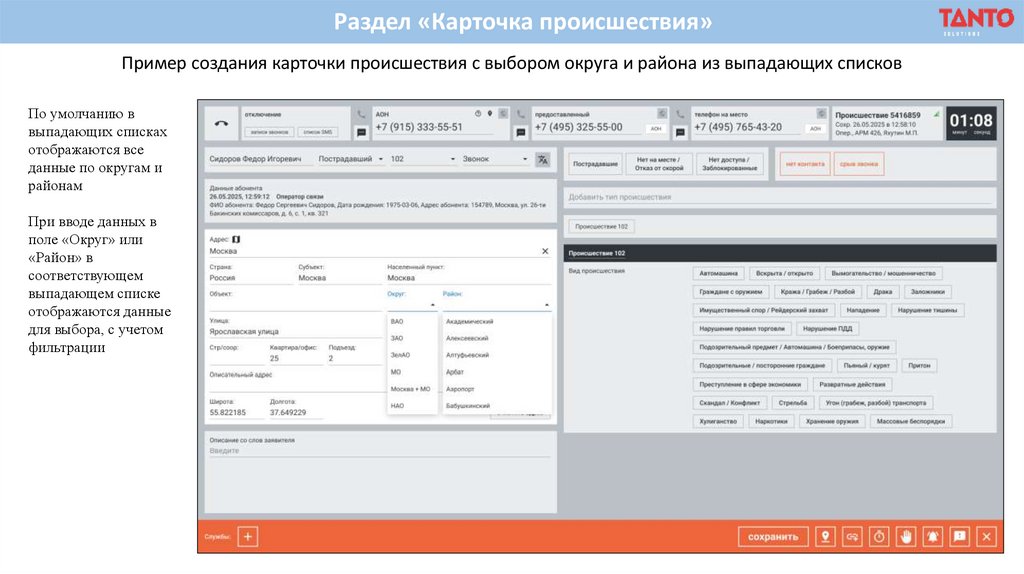 Раздел «Карточка происшествия»Пример создания карточки происшествия с выбором округа и района из выпадающих списков