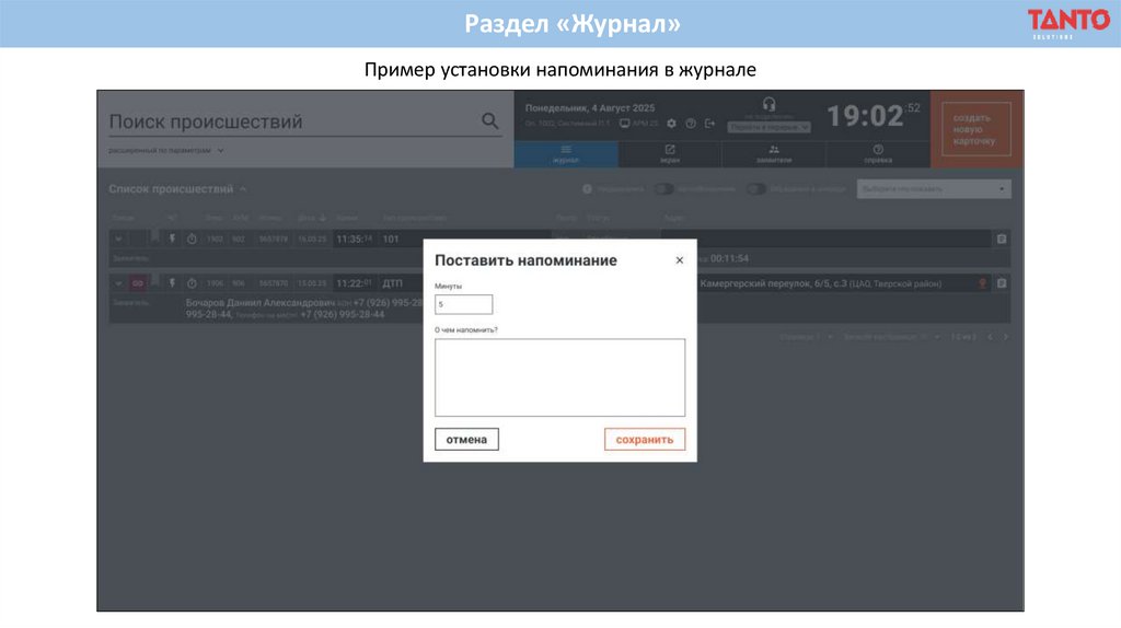 Раздел «Журнал»Пример раздела «Журнал» для оператора