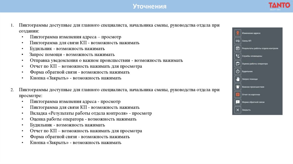 Пиктограммы доступные для главного специалиста, начальника смены, руководства отдела при
