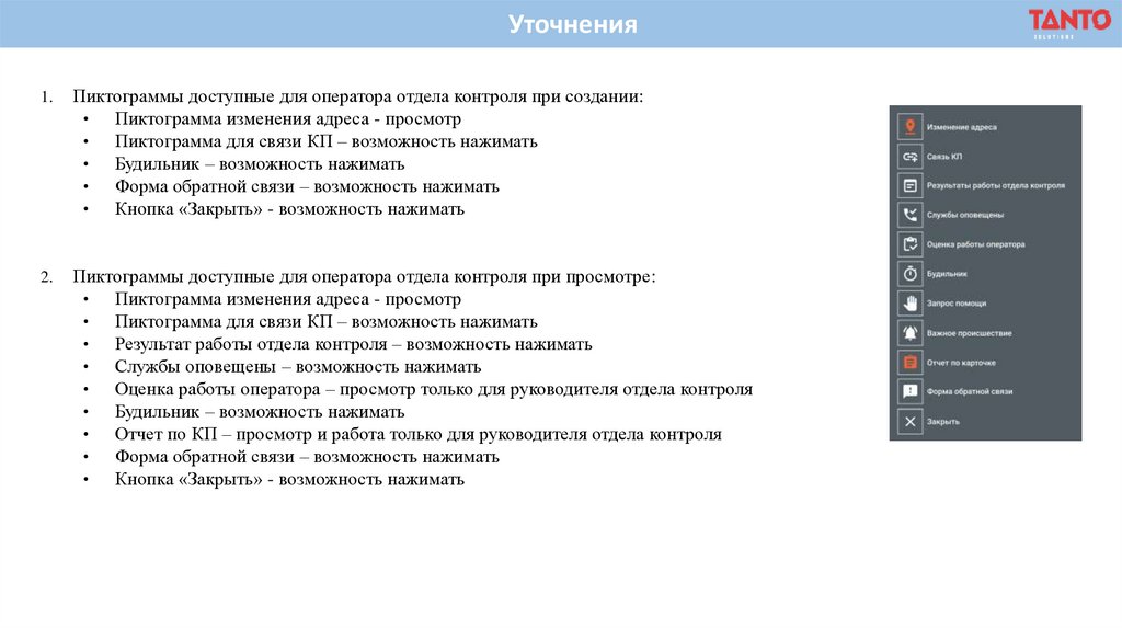 Пиктограммы доступные для оператора отдела контроля при создании: