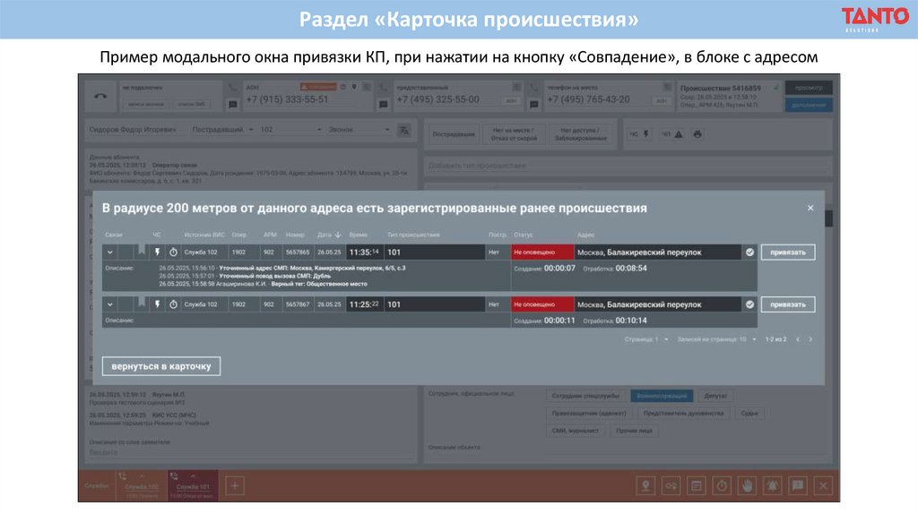 Раздел «Карточка происшествия»Пример модального окна привязки КП, при нажатии на кнопку «Совпадение», в блоке с адресом