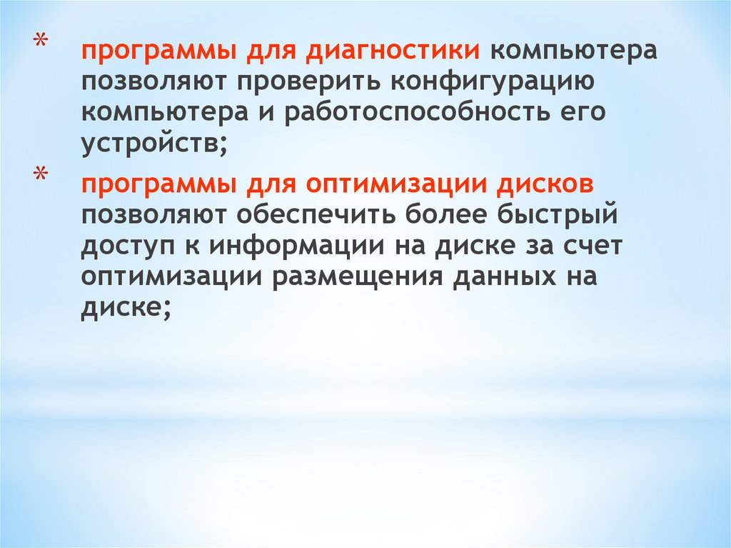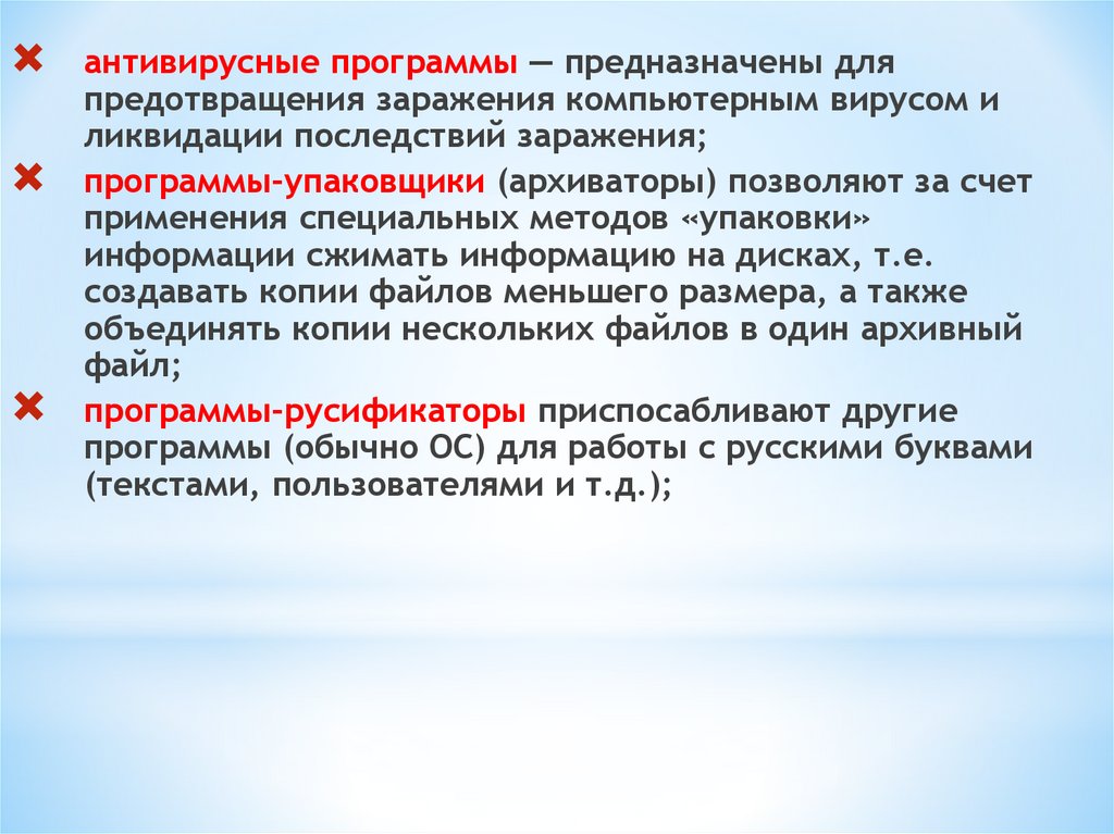 антивирусные программы — предназначены дляпредотвращения заражения компьютерным вирусом и