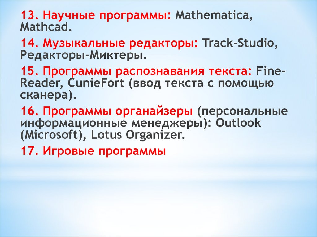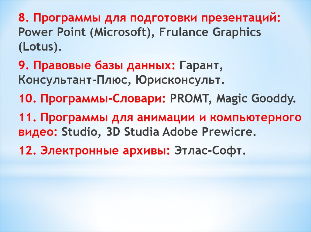 8. Программы для подготовки презентаций:Power Point (Microsoft), Frulance Graphics